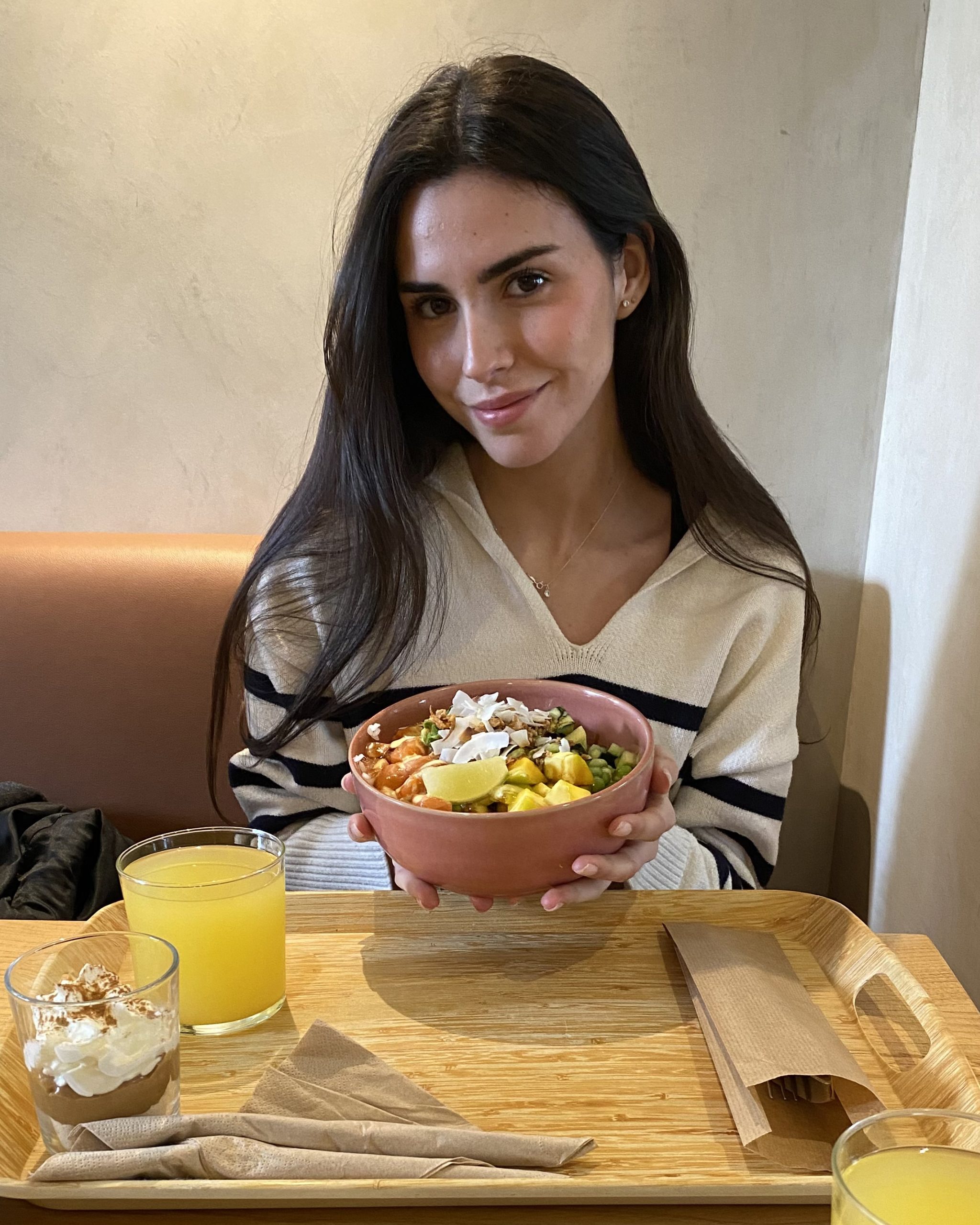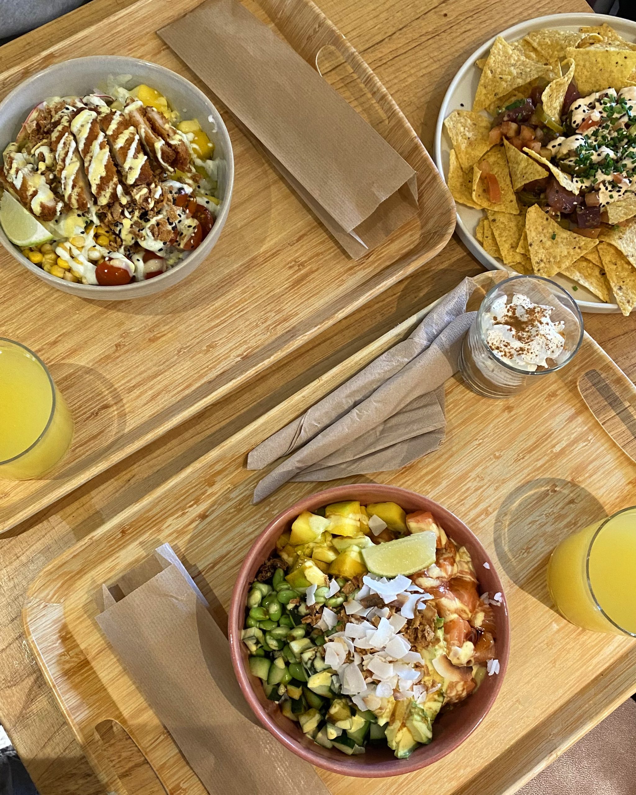 Salmão, atum, picles de cebola roxa, pico de gayo, creme de abacate, alga wakame, edamame, cebola frita, caju, sésamo tostado e cebolinho
